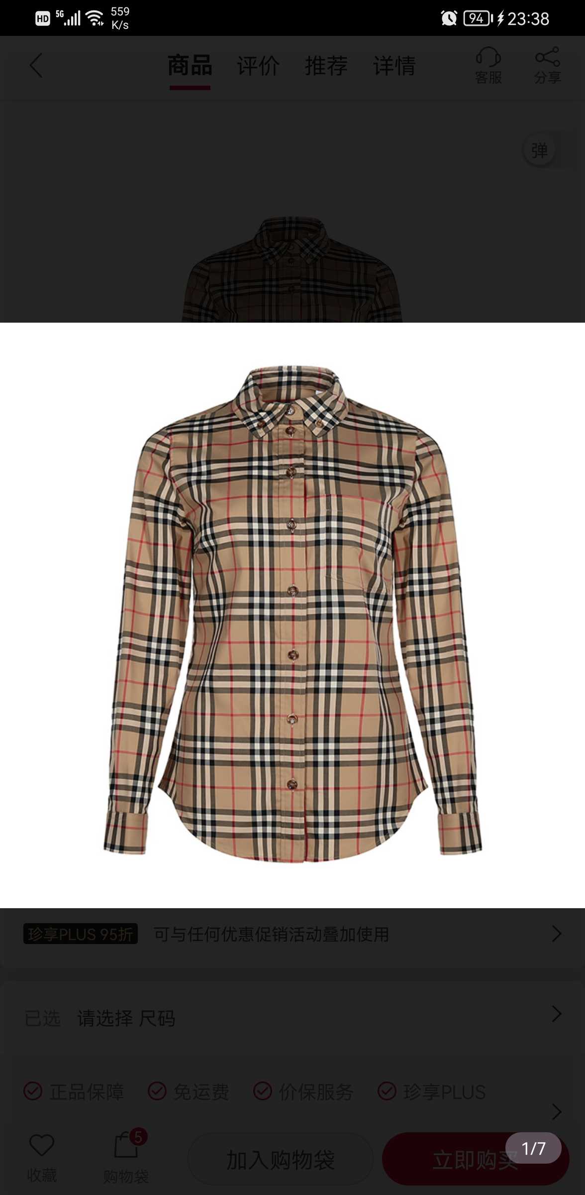 自营Burberry 博柏利 女款修身款领尖扣衣领可翻袖口棉质长袖衬衫典藏米色 80222841