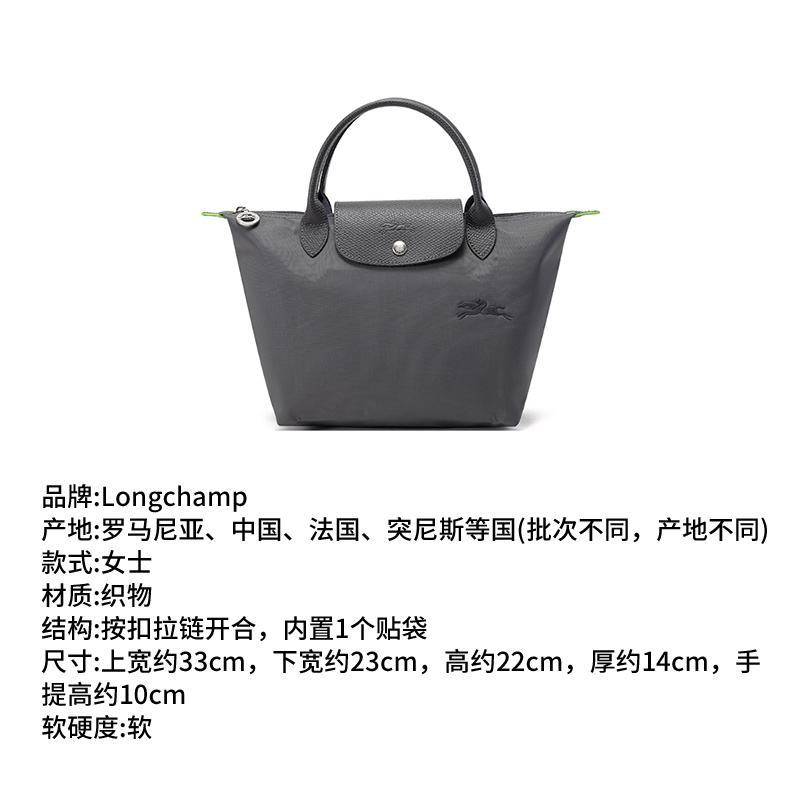 自营Longchamp 珑骧 新品 女士LE PLIAGE GREEN系列小号石墨色织物短柄可折叠手提包饺子包 1621 919 P66