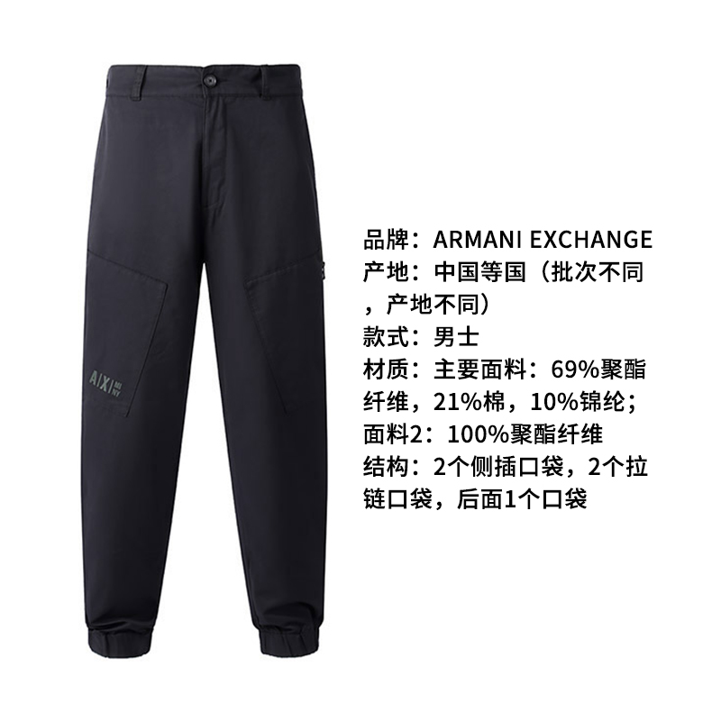 自营Armani Exchange 阿玛尼 男士黑色运动休闲裤慢跑裤长裤 6LZP01 ZNURZ 42AB