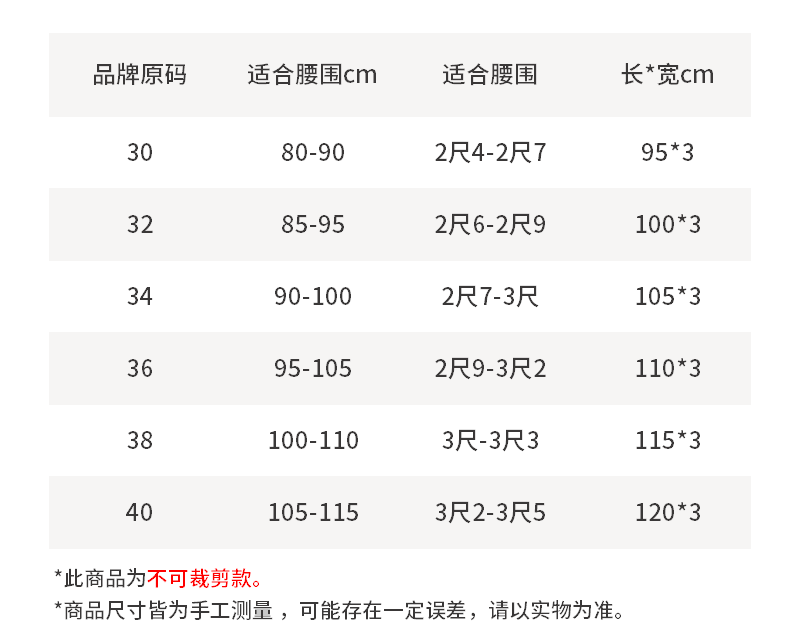 - 结构:板扣式腰带,5个扣眼,扣眼间距2.5cm