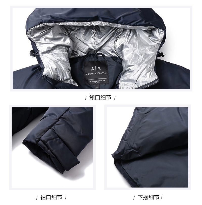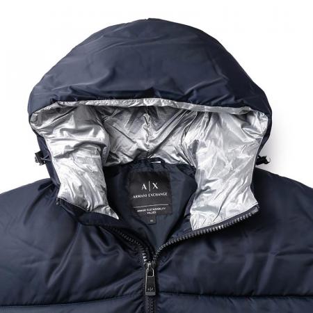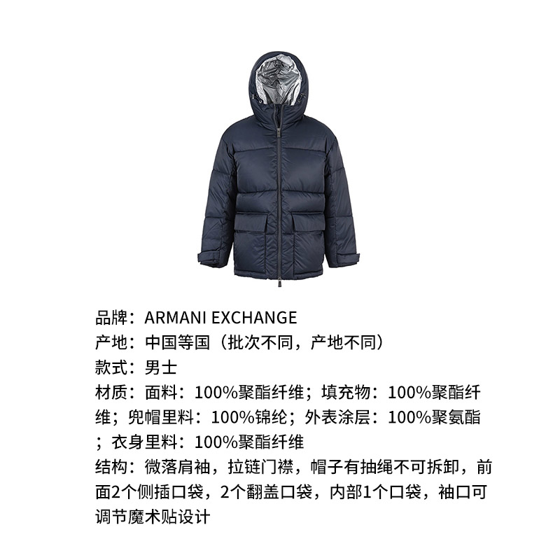 自营Armani Exchange 阿玛尼 男士可持续系列海军蓝色宽松版连帽棉服大衣外套 6RZK45 ZNJ7Z 1510