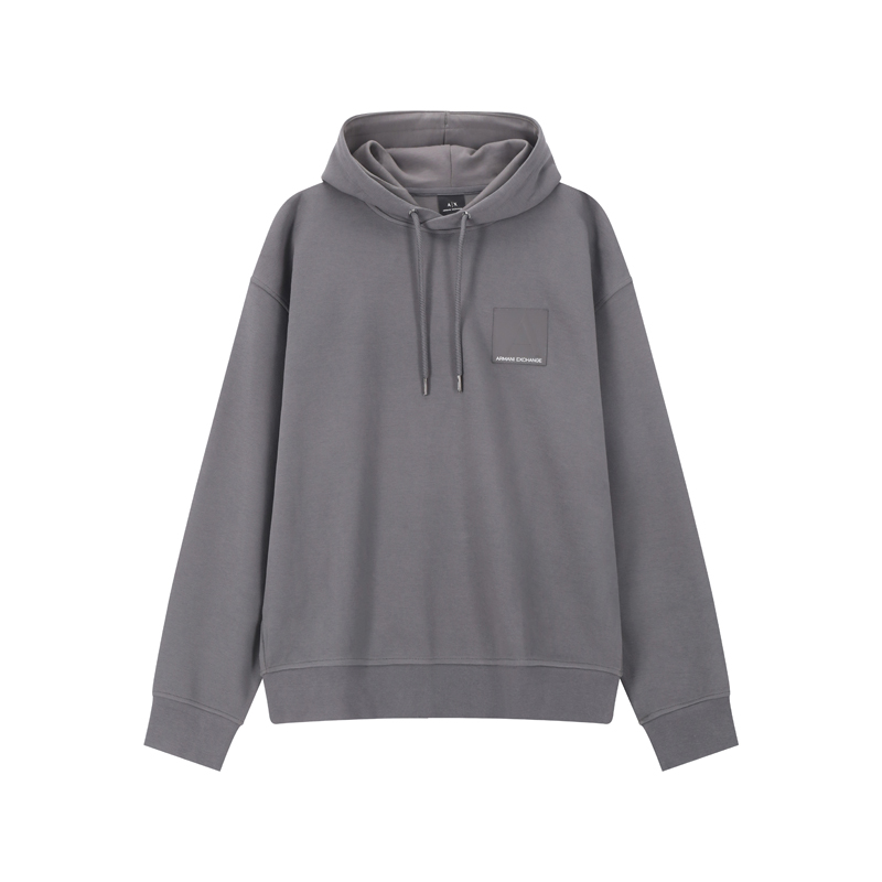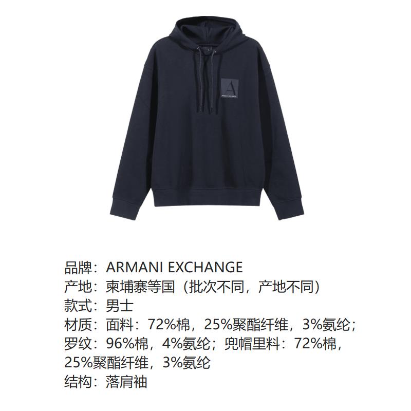 - 此款 ARMANI EXCHANGE 卫衣采用微弹棉质面料,立体宽松廓形裁剪,抽绳调节连帽搭配休闲落肩设计,经典简约的设计,更适合日常穿着。胸口饰有经典方形LOGO贴片,细节处彰显品牌辨识度。