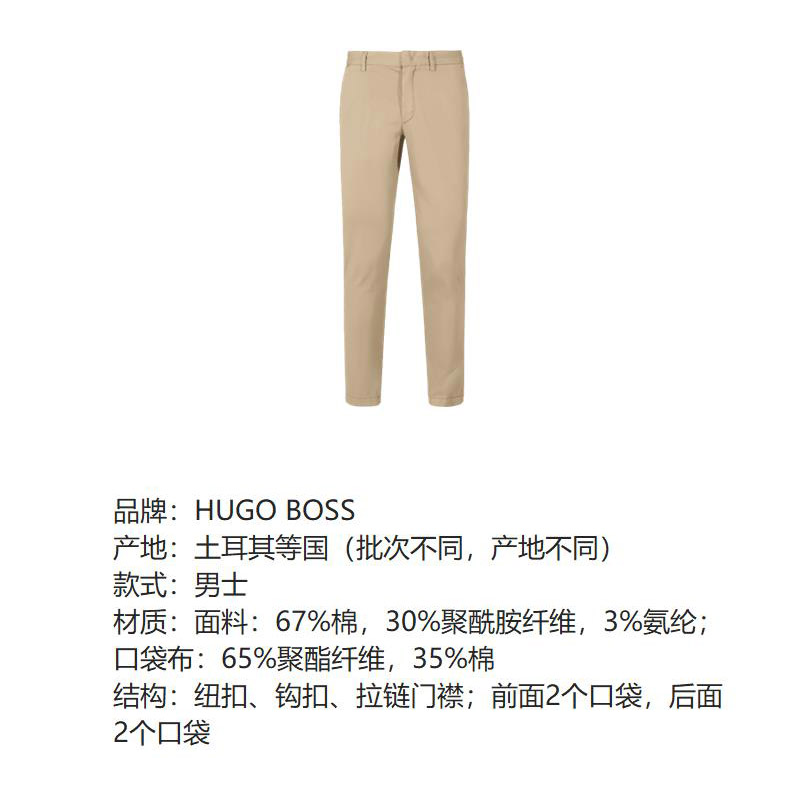 - BOSS Menswear 中腰休闲裤。这款单品采用简洁的修身版型剪裁和舒适的弹力棉质缎面材质。