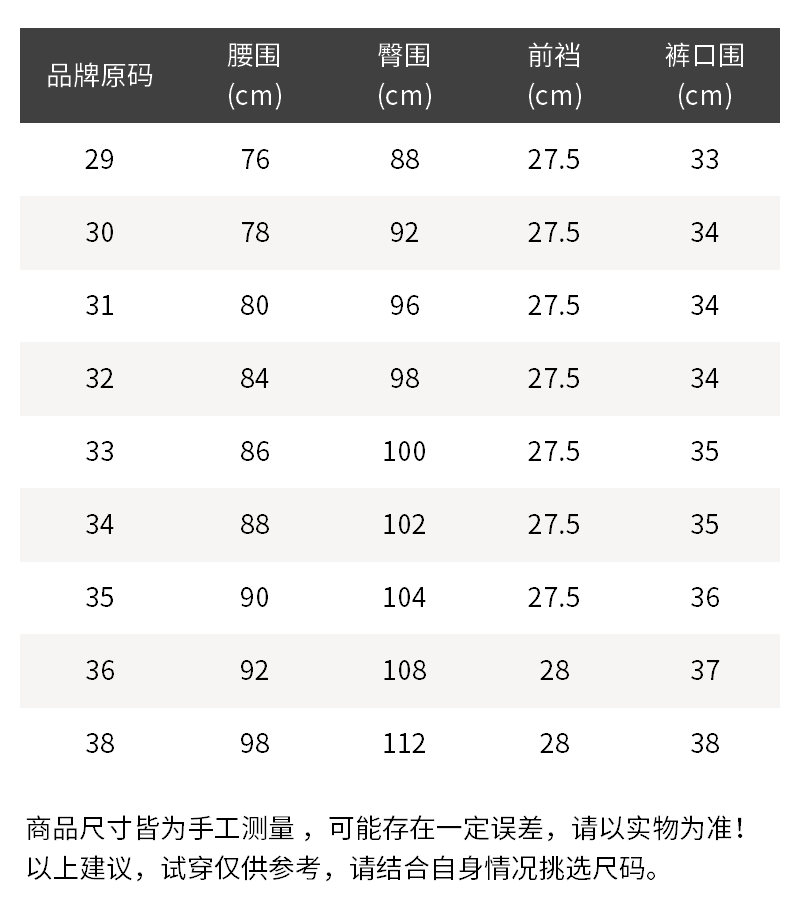 - 温馨提示:1.丢失包装及附件或拆除防损标签/吊牌时不予退换,敬请理解。2.批次不同,产地/细节有所不同,随机发货。3.所有尺寸皆为手工测量,存在1~3cm误差,请以实物为准!