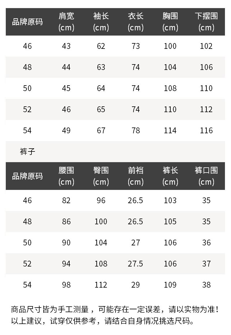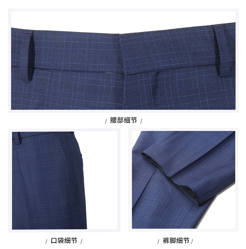 - 结构:两粒单排扣,后双开叉,前面2个口袋,1个胸袋;裤子钩扣拉链门襟,前面2个口袋,后面2个系扣口袋