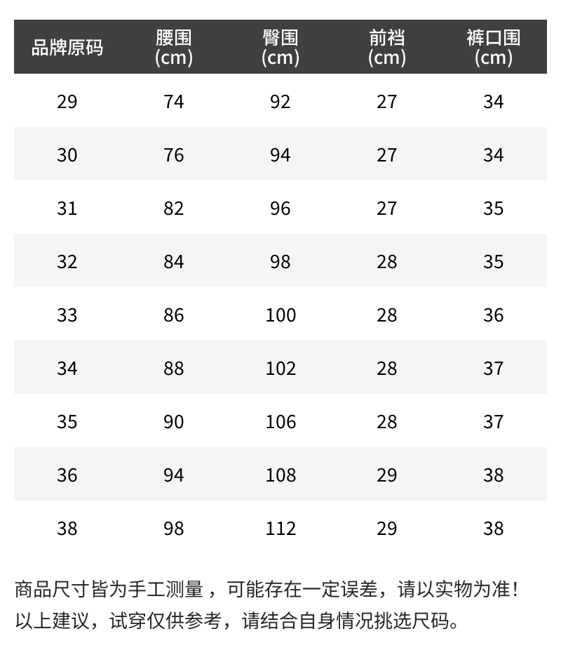 - 温馨提示:1.丢失包装及附件或拆除防损标签/吊牌时不予退换,敬请理解。2.批次不同,产地/细节有所不同,随机发货。3.所有尺寸皆为手工测量,存在1~3cm误差,请以实物为准!
