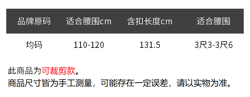 - 结构:针扣式腰带,5个扣眼,长度可裁剪
