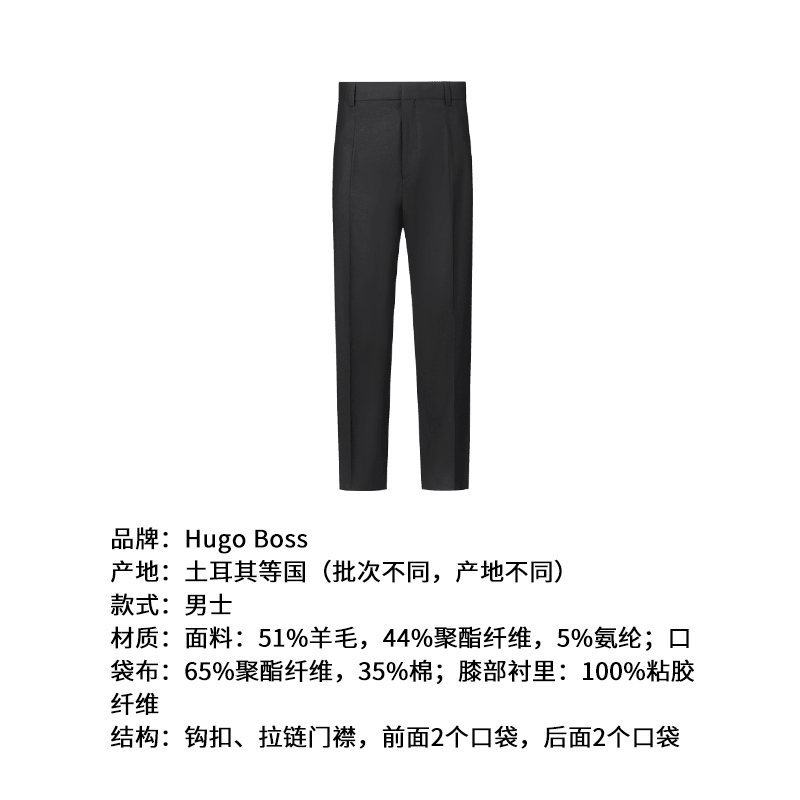 - 材质:面料:51%羊毛,44%聚酯纤维,5%氨纶;口袋布:65%聚酯纤维,35%棉;膝部衬里:100%粘胶纤维