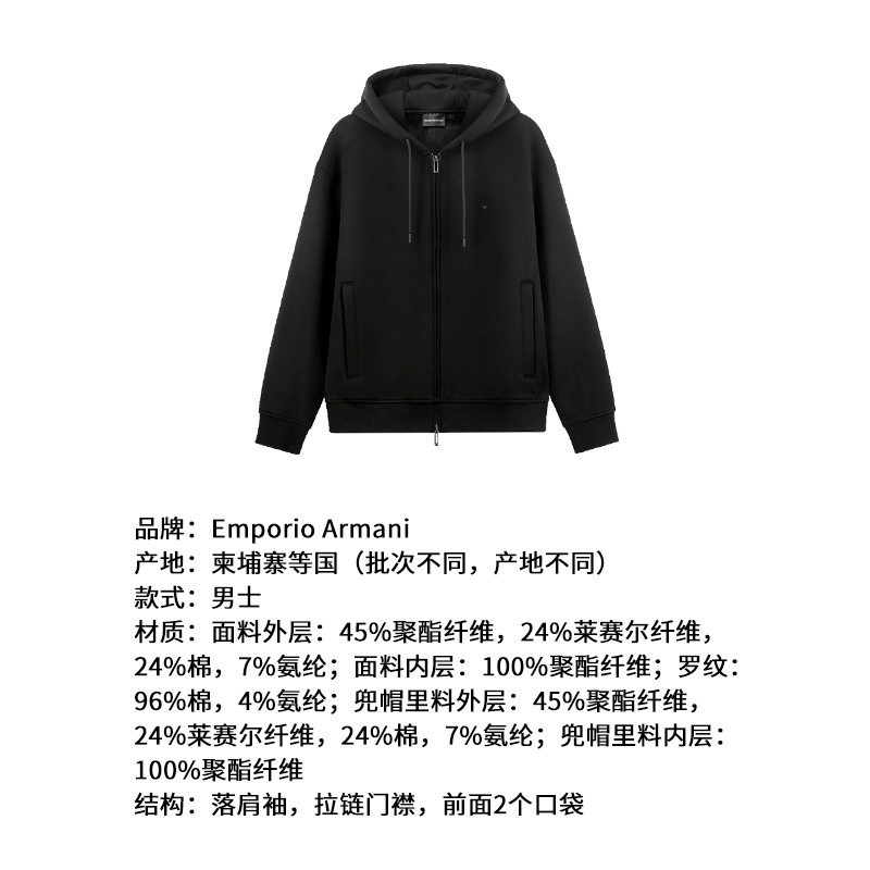 - 此款 EMPORIO ARMANI 卫衣外套正面全拉链开合,配有抽绳调节连帽,无论是锻炼还是休闲,这款外套都能缔造舒适穿着体验。胸口点缀小巧鹰标刺绣,精美别致,重释经典。