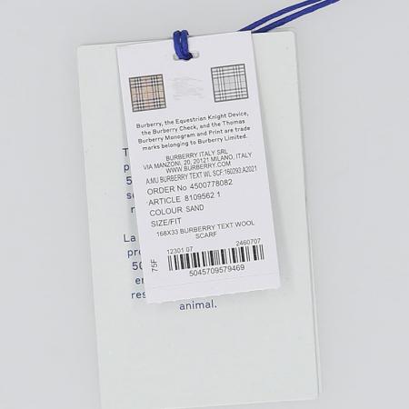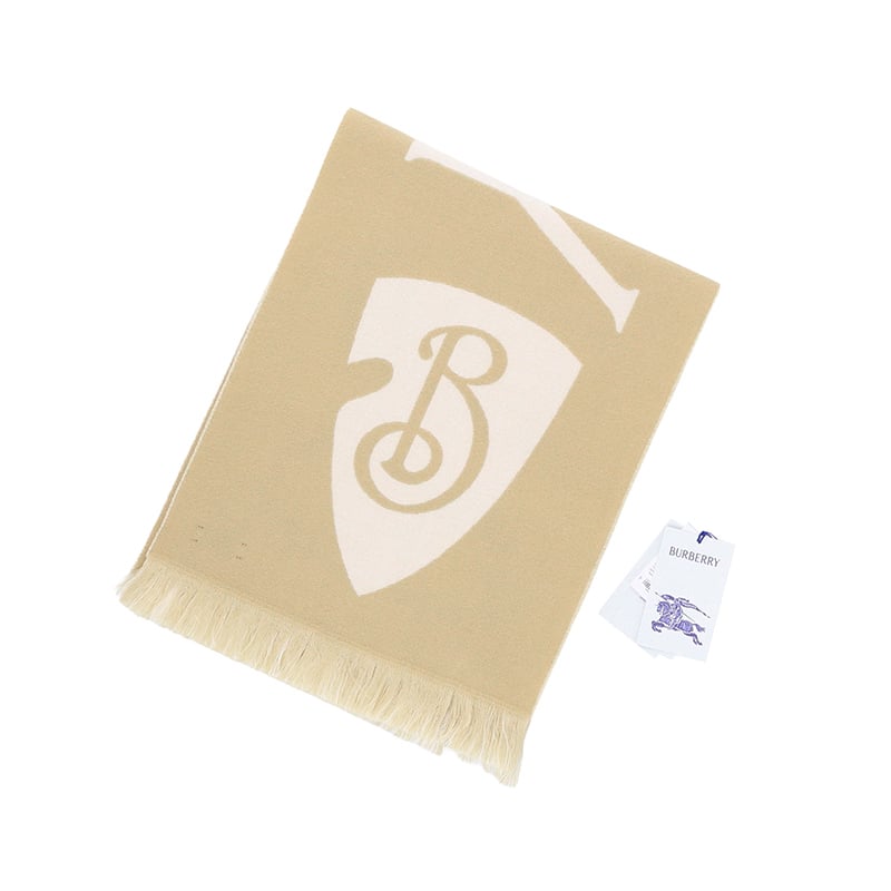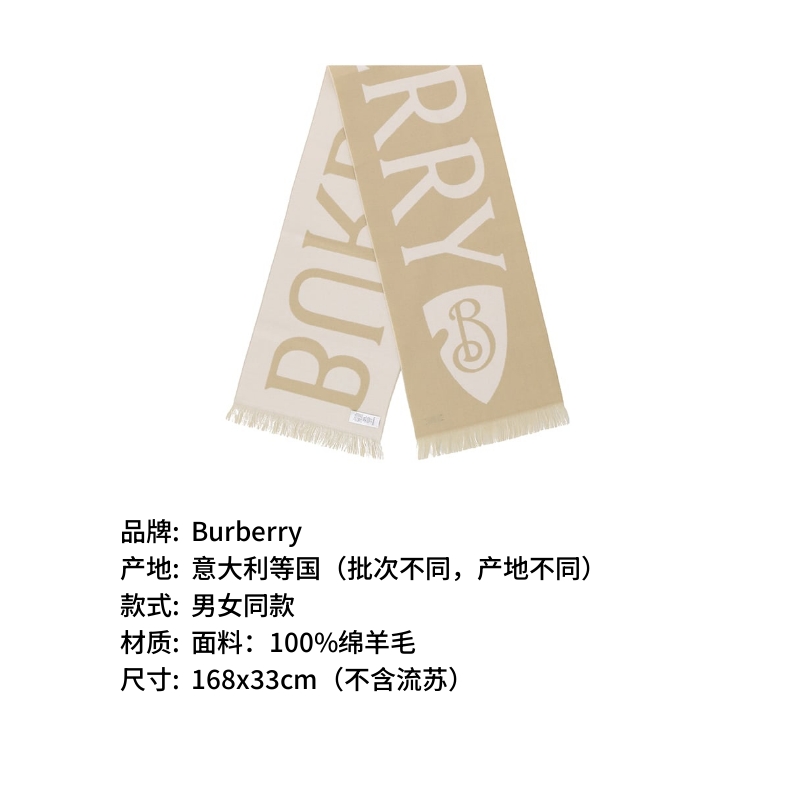 自营Burberry 博柏利 新品 男士/女士绵羊毛沙色徽标图案细穗流苏保暖围巾168x33cm 81095621
