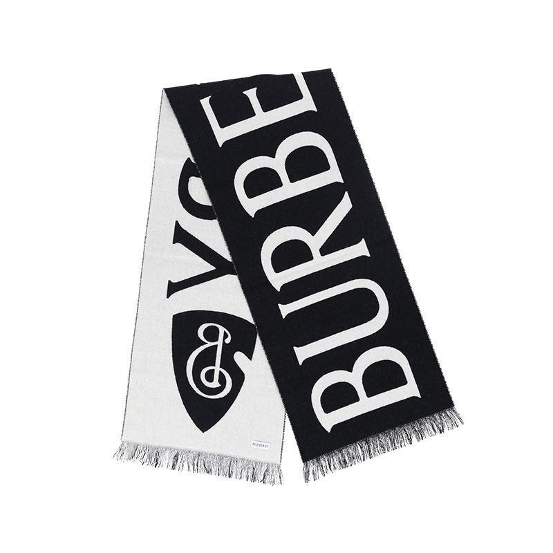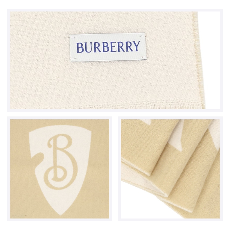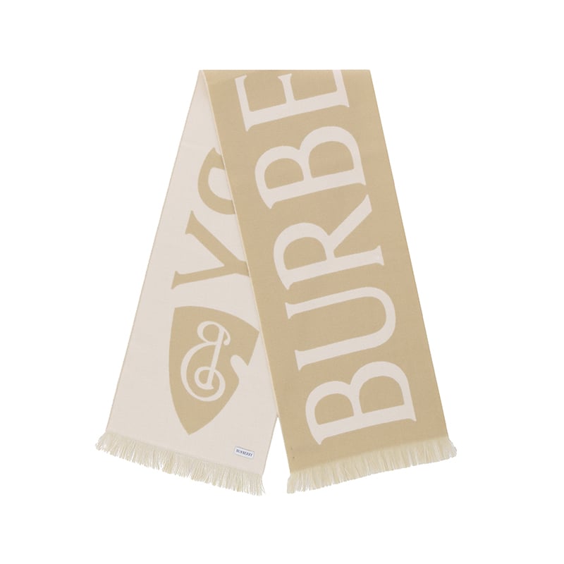 - 双色羊毛围巾,于意大利工坊精制而成。装饰提花精纺的 Burberry 字母徽标和 B 字型盾牌图案,灵感源自品牌马术骑士徽标(EKD)。