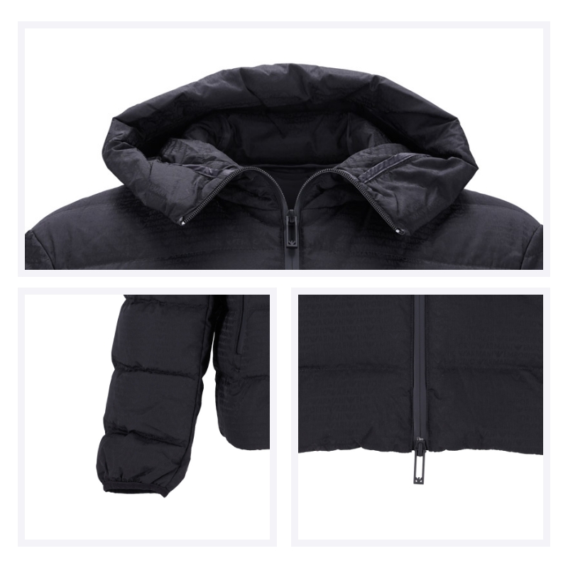 - 此款 EMPORIO ARMANI 羽绒服设有抽绳连帽和全拉链前襟,通体点缀密实的字母标识提花图案,采用绗缝设计,风格时尚、款式精美,羽绒填充物提升其功能性和现代感。