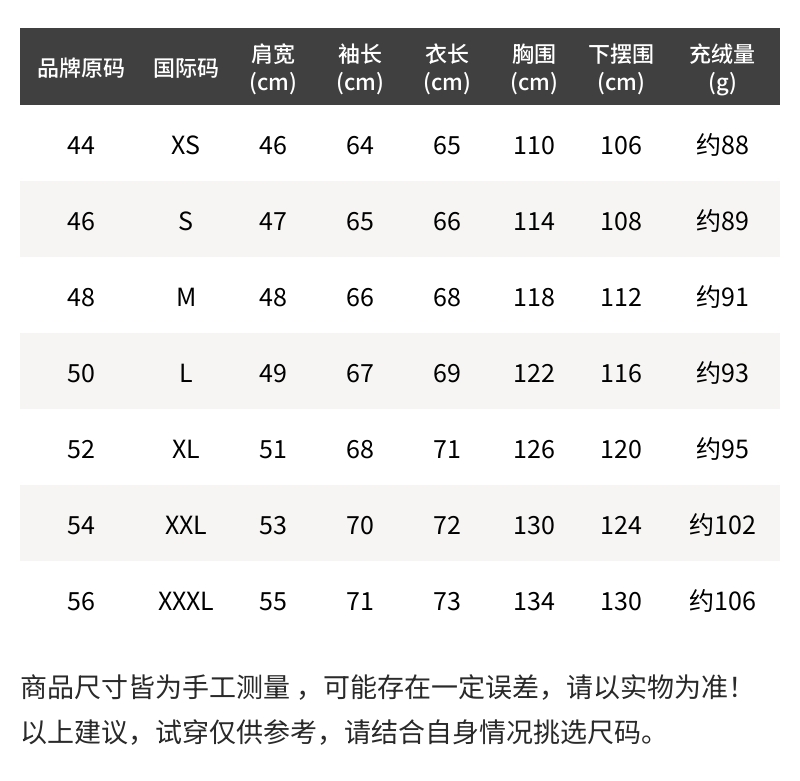 - 材质:面料:100%锦纶;填充物:90%白鸭绒,10%白鸭羽毛;里料:100%锦纶