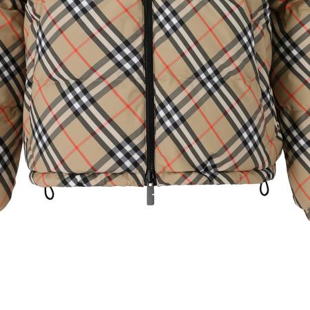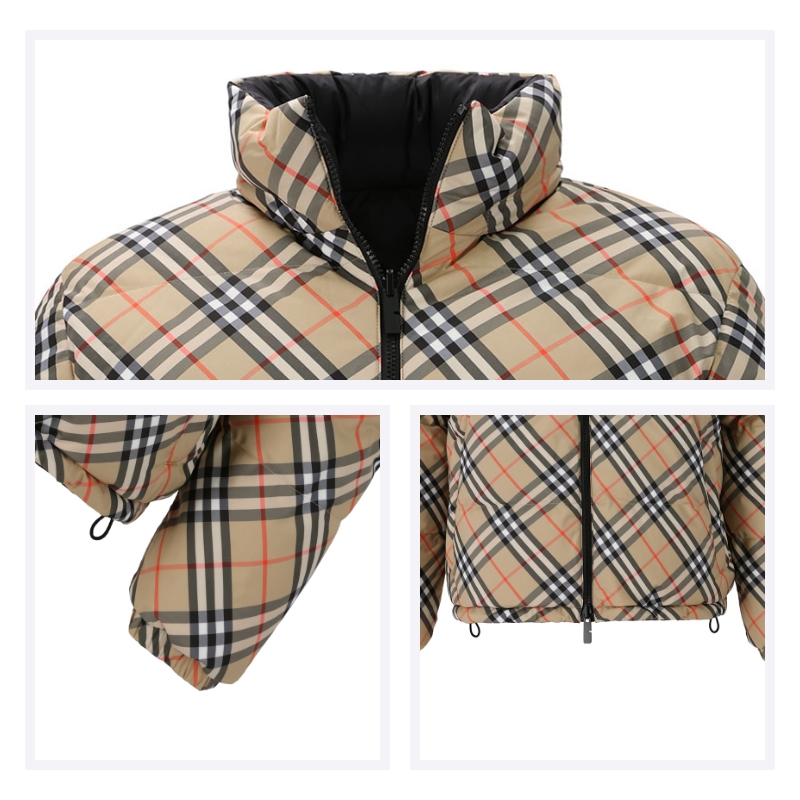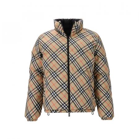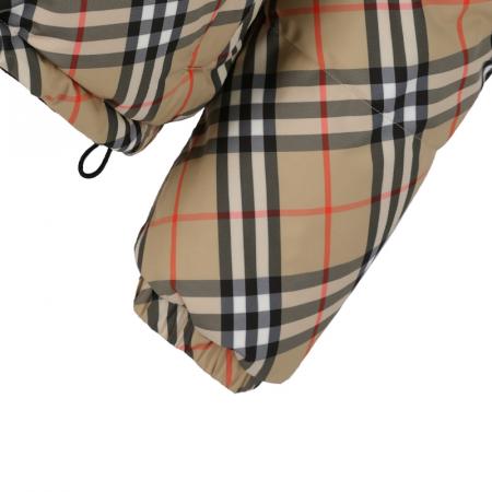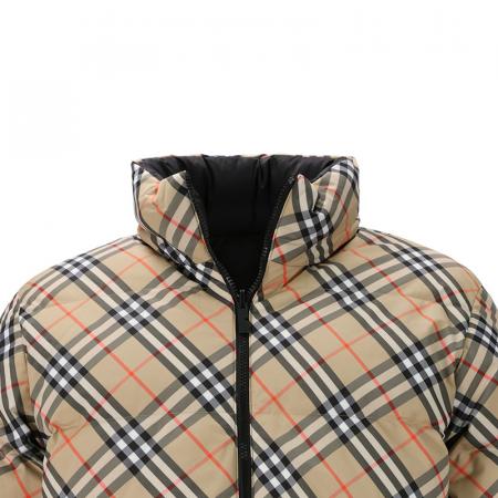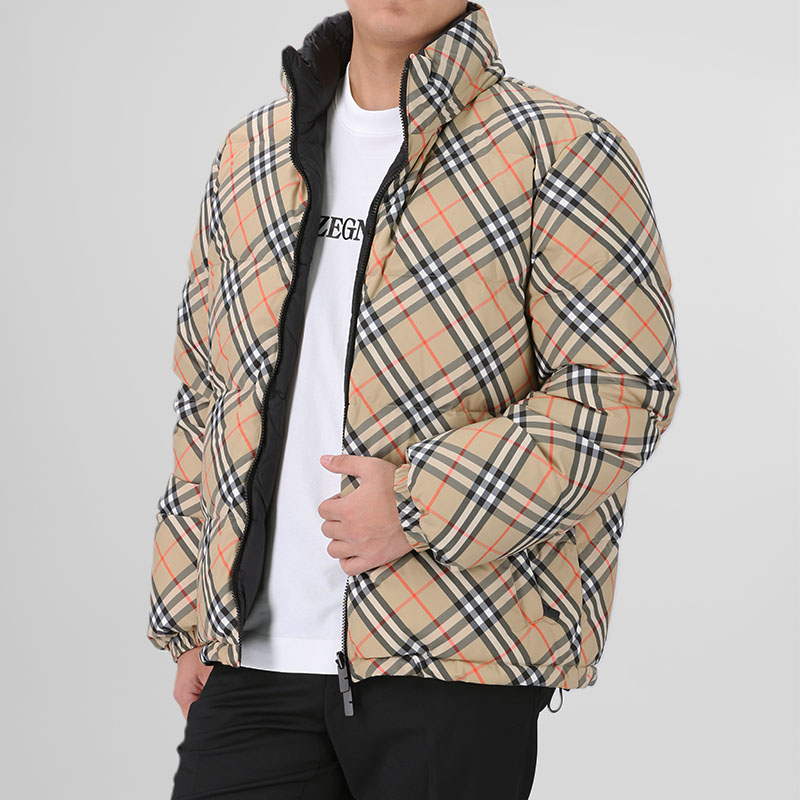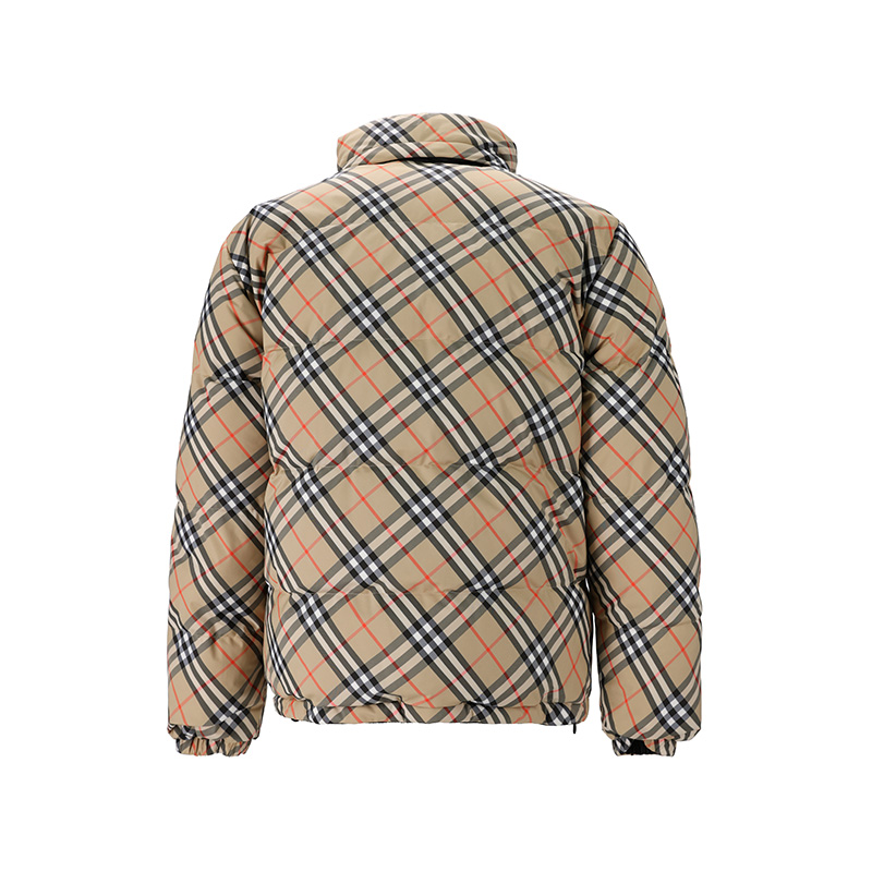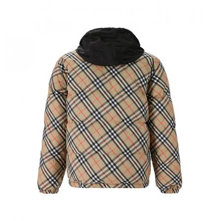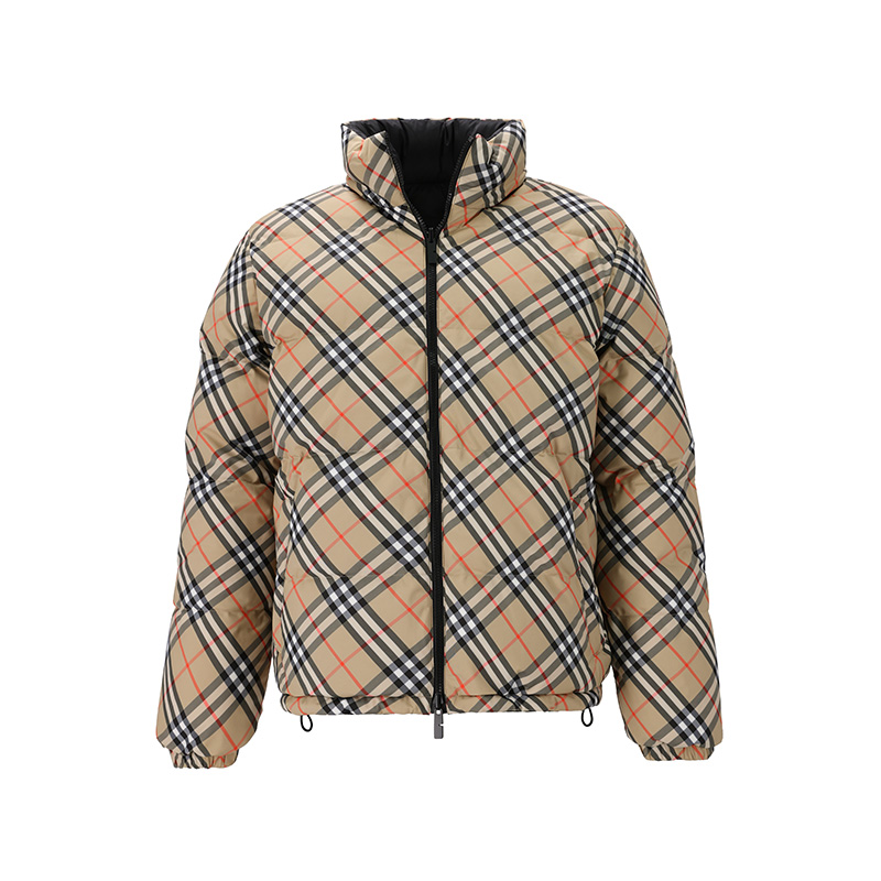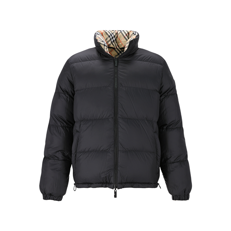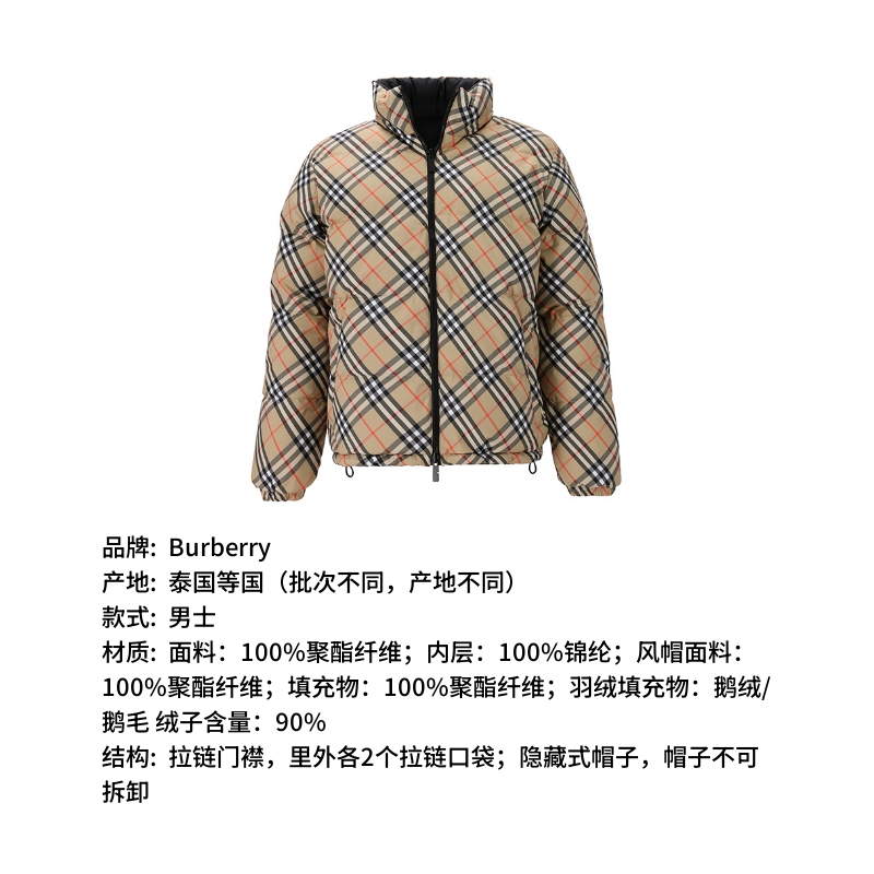 - 羽绒服,充盈填充鹅绒与鹅毛,呈现休闲版型。双面两穿款式,一面装饰标志性沙色 Burberry 格纹,另一面为点缀品牌骑士印章贴花的纯色设计。搭配便携式连帽,从容应对变幻天气。