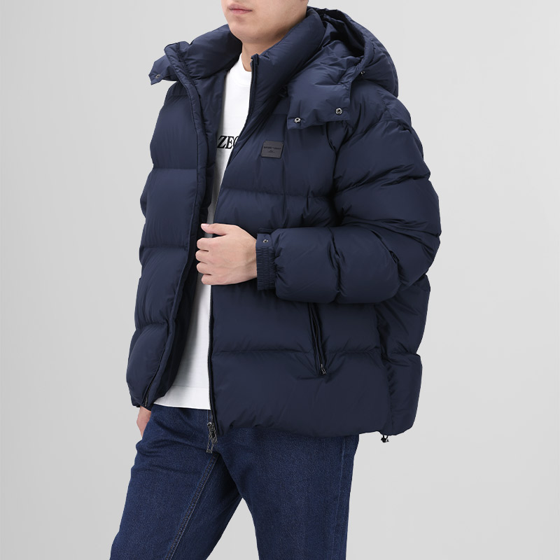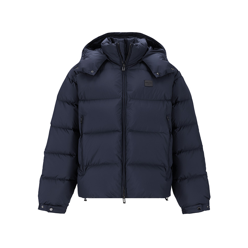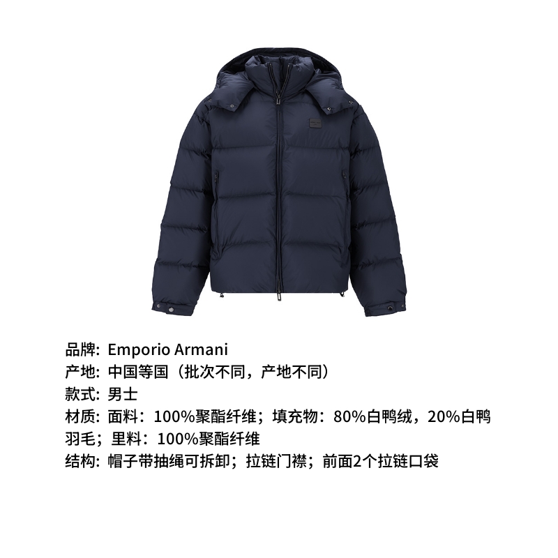自营Emporio Armani 阿玛尼 新品 男士海军蓝色小徽标贴饰连帽拉链鸭绒面包羽绒服外套 EM003050 AF18231 UB118