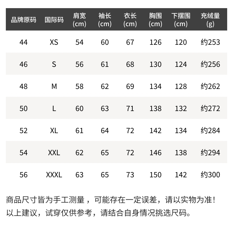 - 材质:面料:100%聚酯纤维;填充物:80%白鸭绒,20%白鸭羽毛;里料:100%聚酯纤维