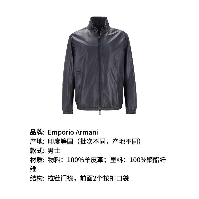 - 此款 EMPORIO ARMANI 皮衣线条利落简洁,采用柔软舒适的皮革制成,是实用的日常装束的理想之选
