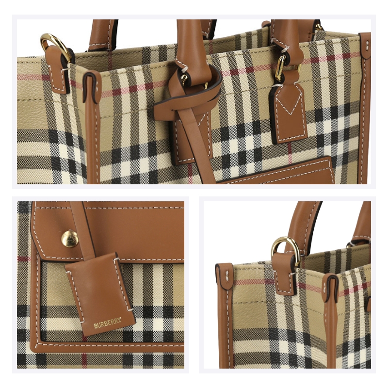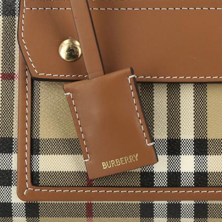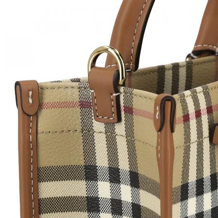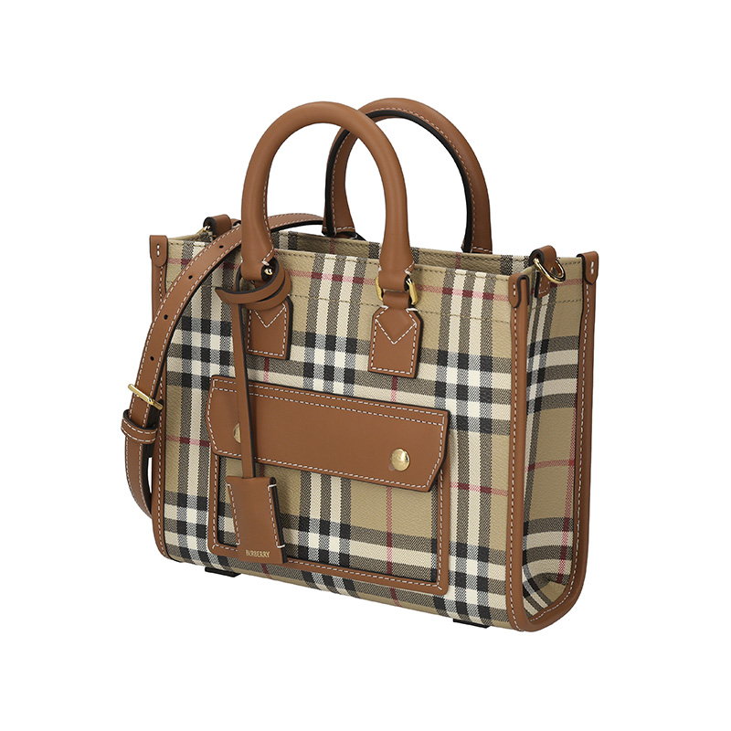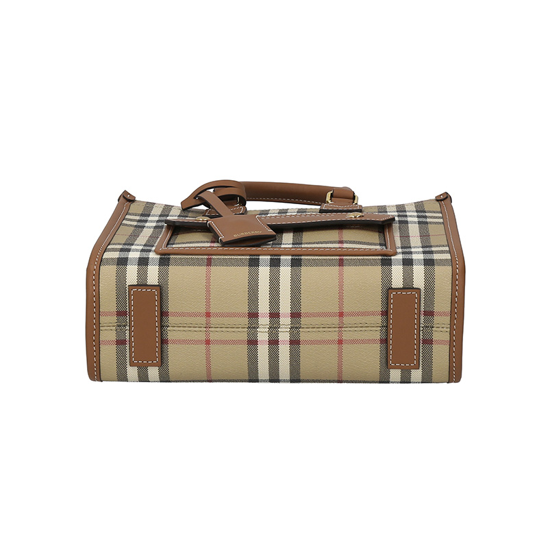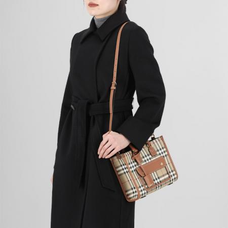 - 精巧托特包,选用 Burberry 格纹涂层棉质混纺面料打造,于意大利工坊匠制而成。融入缉明线小牛皮革饰边,搭配棉质内衬。正面设有磁扣口袋,灵感源自品牌典藏设计。