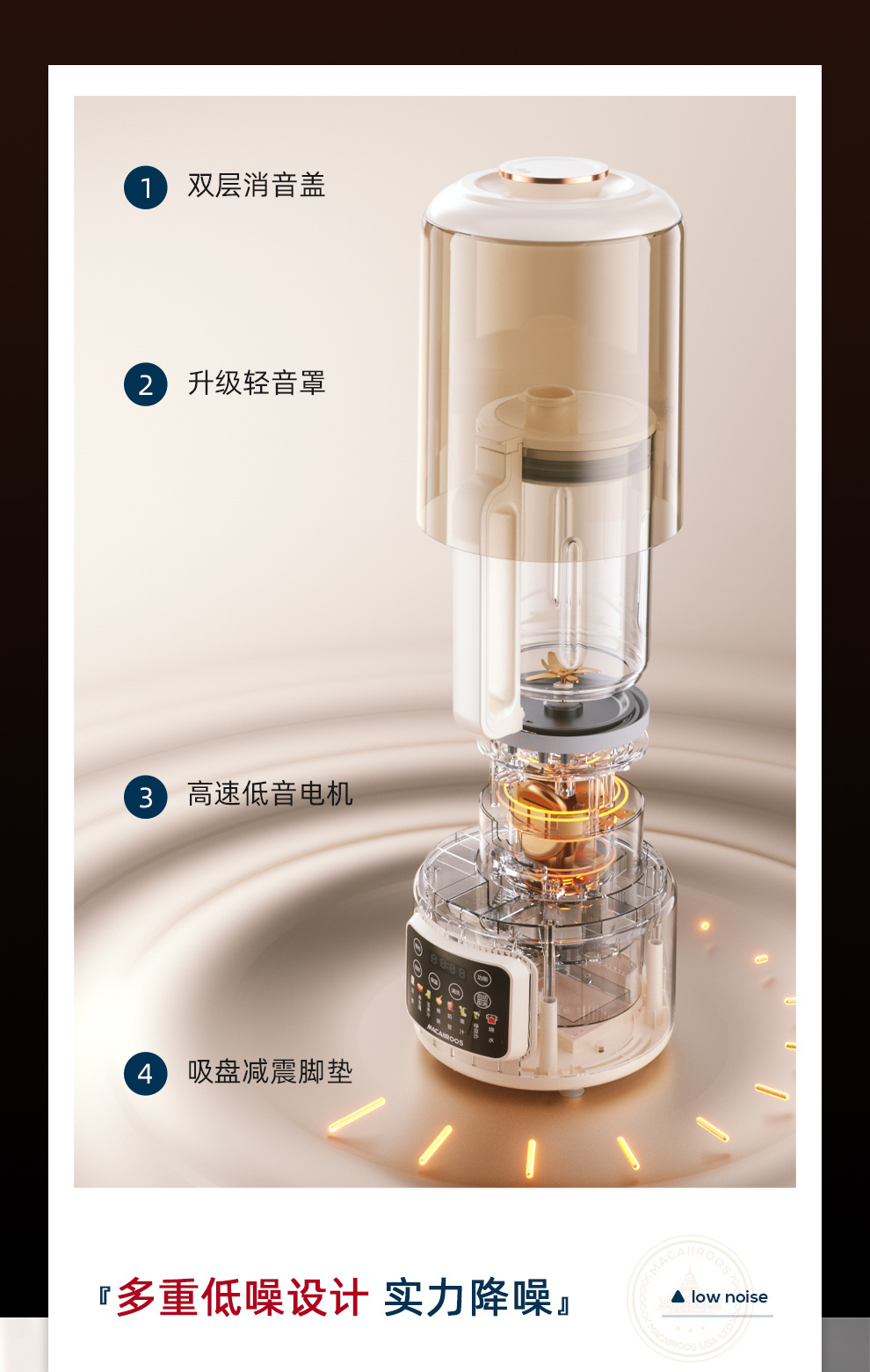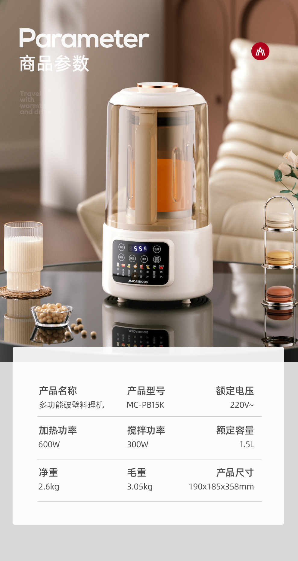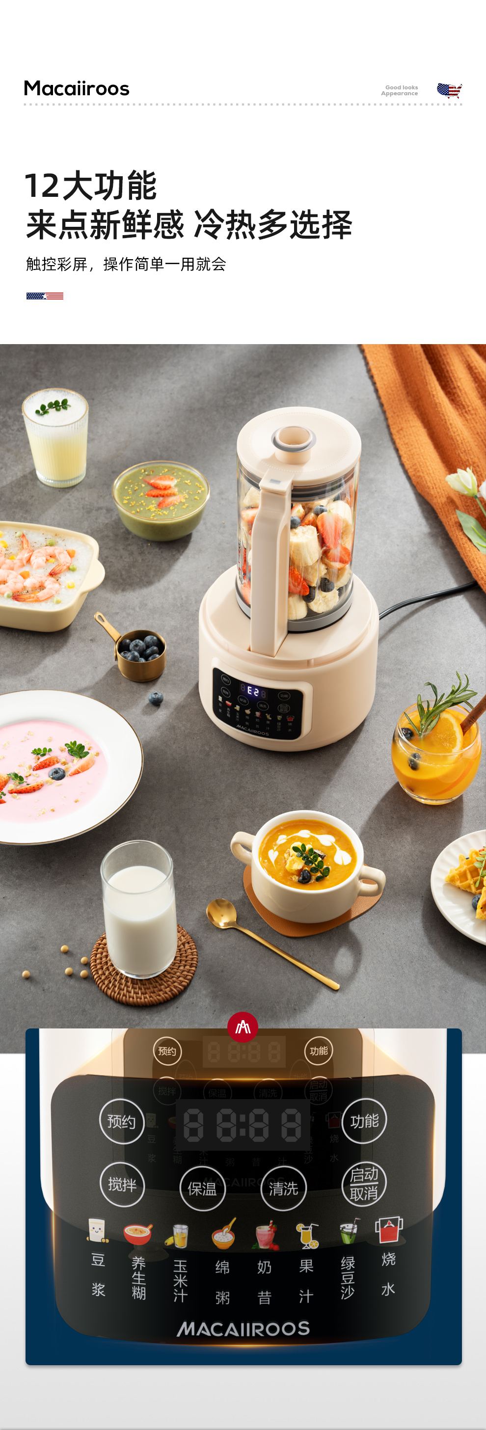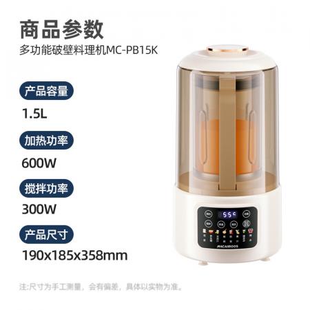 MACAIIROOS MACAIIROOS美国迈卡罗带静音罩低噪音设计12项多功能破壁料理机MC-PB15K