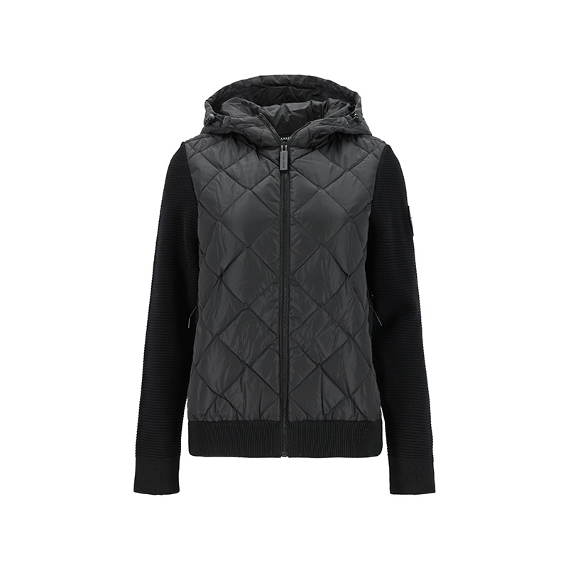 - HyBridge® 绗缝针织连帽衫采用 Thermal Mapping® 智能温控科技,于易出汗的高热区域增强透气。精选柔软透气的美利奴羊毛面料制作,并于前身、上背与兜帽处采用菱形绗缝羽绒夹层,为关键部位增添保暖屏障。