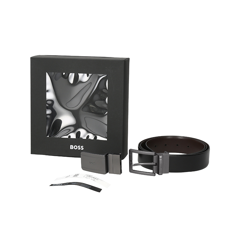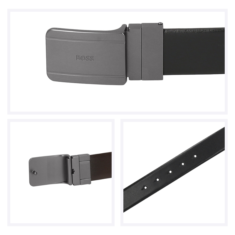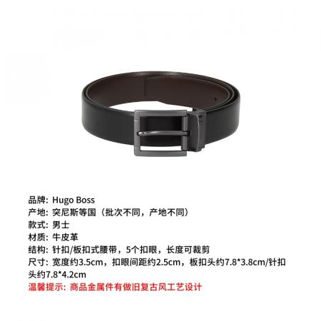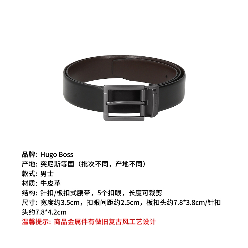 自营Hugo Boss 雨果博斯 26春夏新品 男士牛皮革黑色/棕色可裁剪复古针扣/板扣可替换扣头双面旋转皮带腰带3.5cm 50558756 002