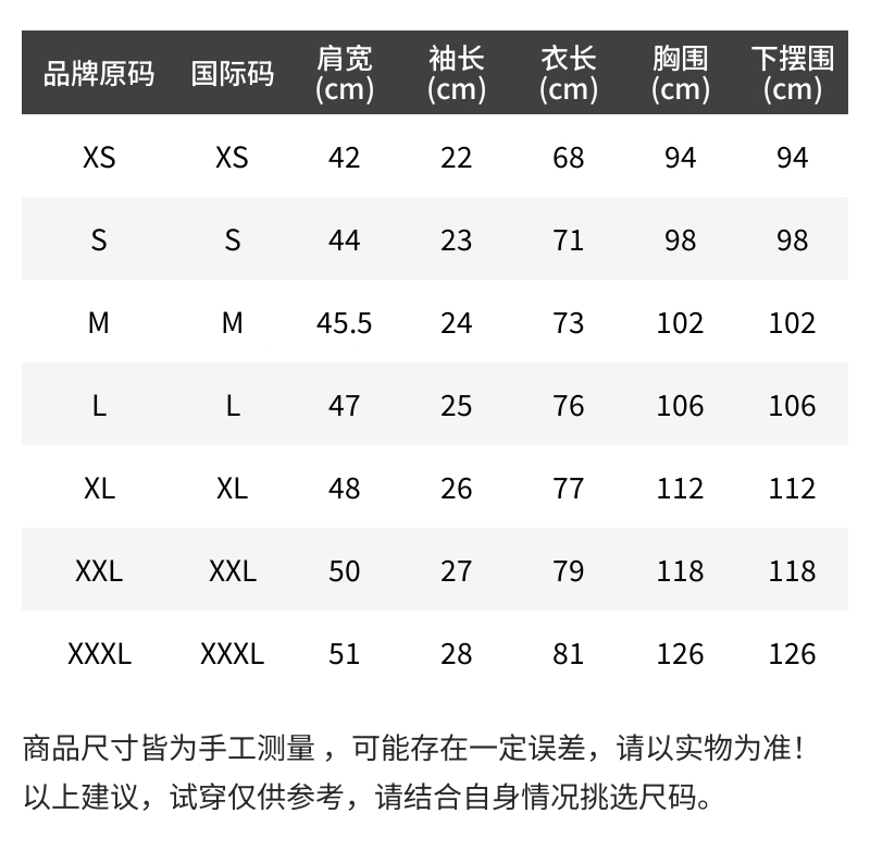 - 温馨提示:1.丢失包装及附件或拆除防损标签/吊牌时不予退换,敬请理解。2.批次不同,产地/细节有所不同,随机发货。3.所有尺寸皆为手工测量,存在1~3cm误差,请以实物为准!